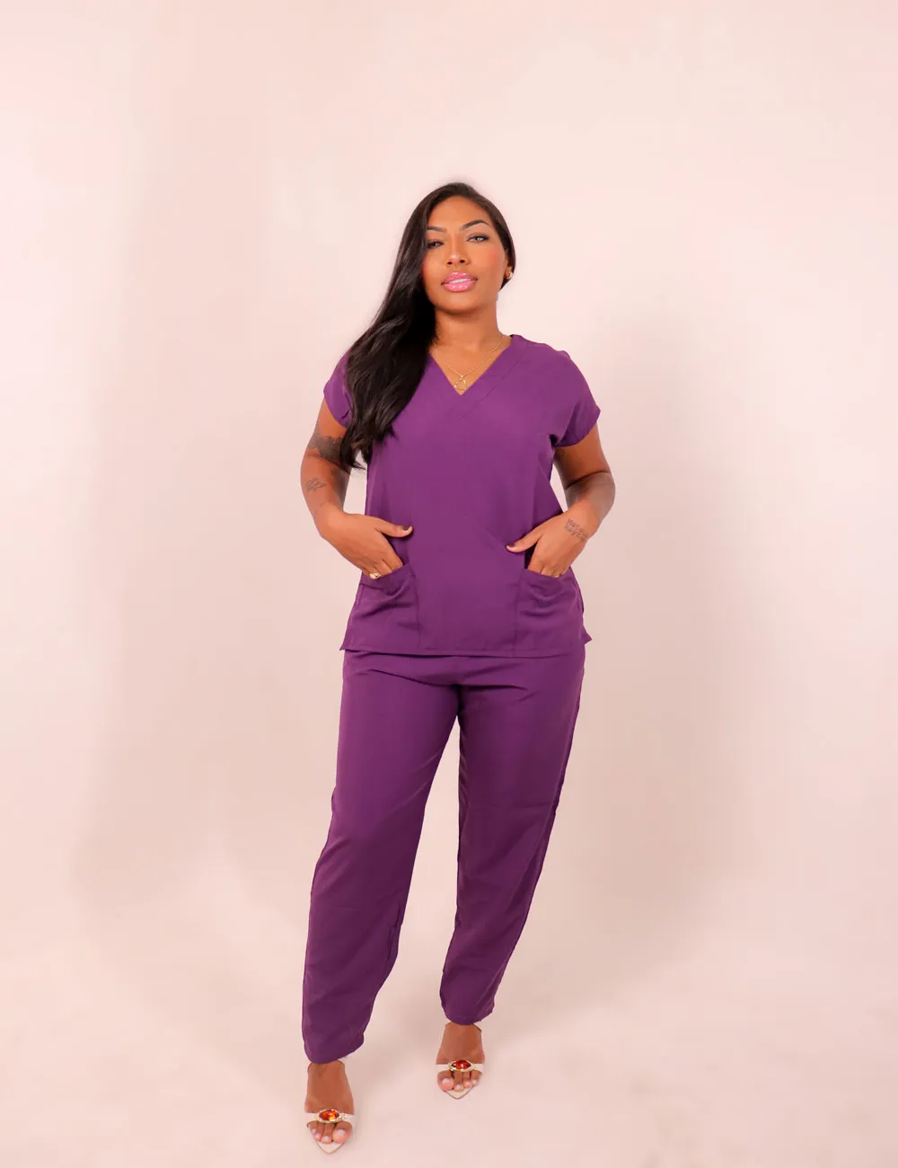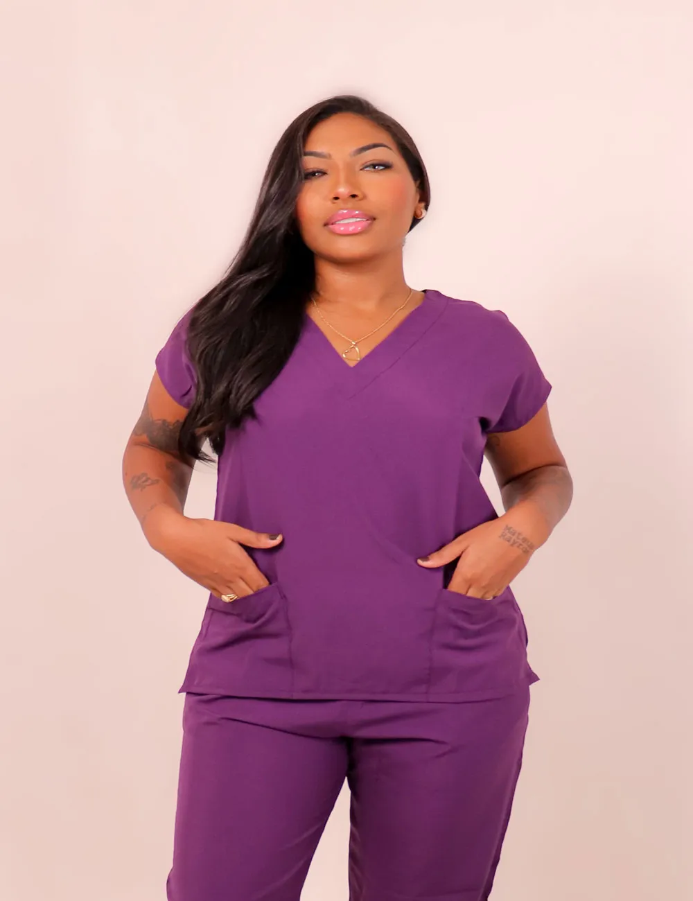 Resistência ao Desgaste: O tecido não amassa e não desbota, mantendo sua aparência profissional mesmo após várias lavagens. Secagem Rápida: Após a lavagem, os scrubs secam rapidamente, permitindo que você os utilize novamente sem demora.